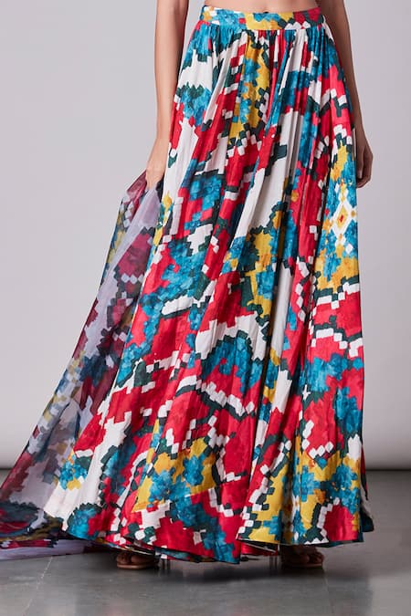 Multi-color flared chanderi lehenga with all-over ikat print.