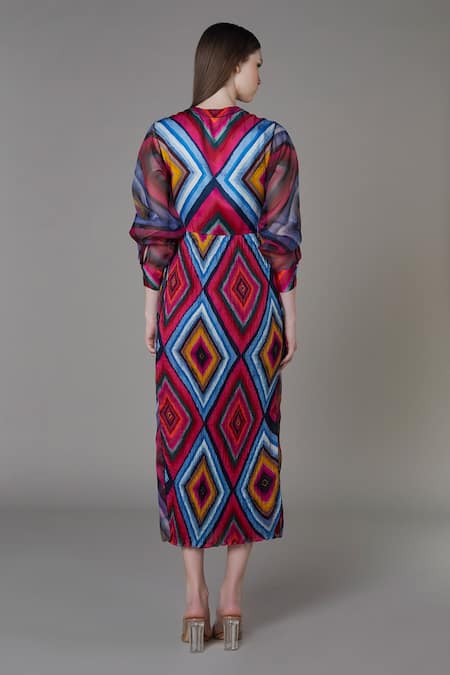 Multicolored tunic style midi dress with diamond print, organza sleeves & side tie-up detailing.