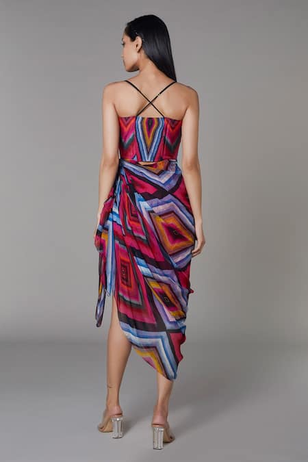 Pink, blue draped dress with diamond print & sweetheart neckline.