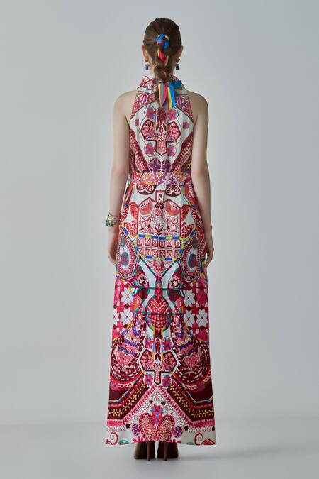 Ivory maxi dress featuring an all-over mandala paisley print and a collared neck. Comes with a coordinating belt for added style.