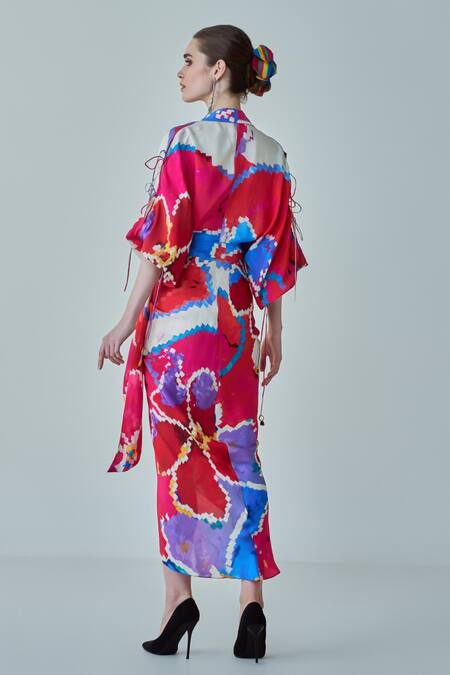 Pink and red habutai asymmetric wrap dress featuring an attached belt, o-ring, and sleeve tie-ups