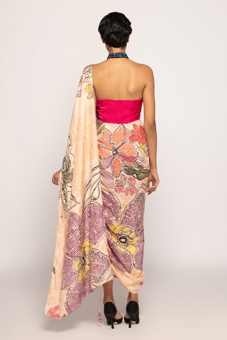 Peach pre-draped saree featuring floral and abstract prints