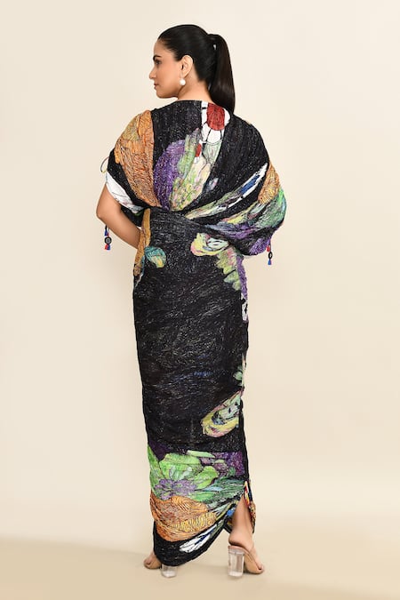 Black Chiffon Round Neck Gathered Kaftan Dress With Abstract Prints