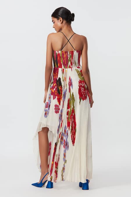 Ivory hand micro pleated asymmetric dress featuring abstract floral placement print and hand embroidered mirror and thread work detailing