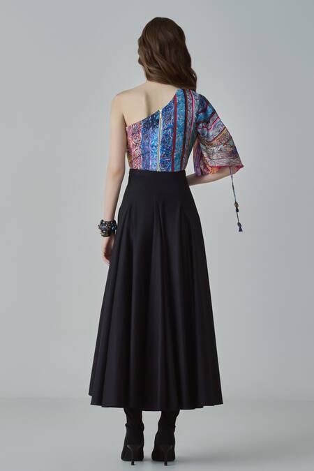 Multi color one shoulder blouse featuring all over abstract block prints and part hand micro pleating