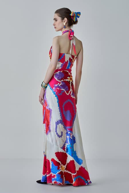 Red and pink satin maxi dress featuring a halter neck design with a relaxed fit