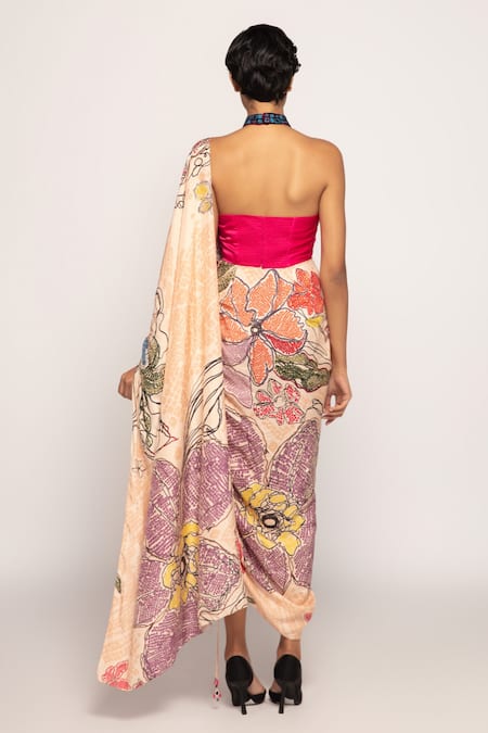 Pink silk blouse featuring a halter neck and mirror work embellished neck band