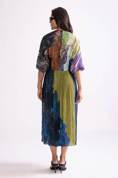 Multicolor midi dress featuring a vibrant daisy print and three-quarter tie-up sleeves. Includes a coordinating slip for added coverage.