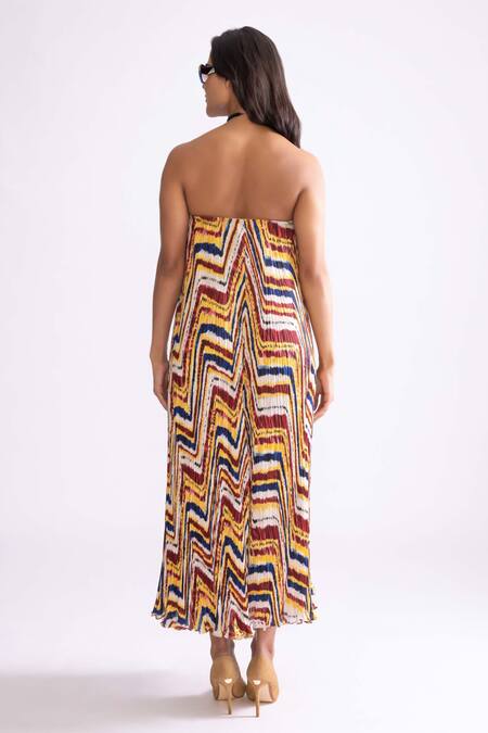 Multi-color strapless maxi dress featuring a zig-zag print with micro pleat detailing