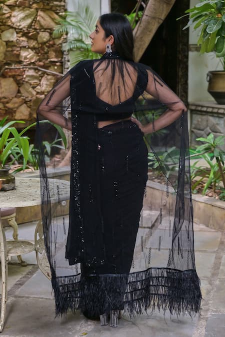 Black pre-draped saree featuring a bead and sequin embroidered border. Accompanied by a sleeveless embroidered blouse and a sheer cape with feather embellishments.
