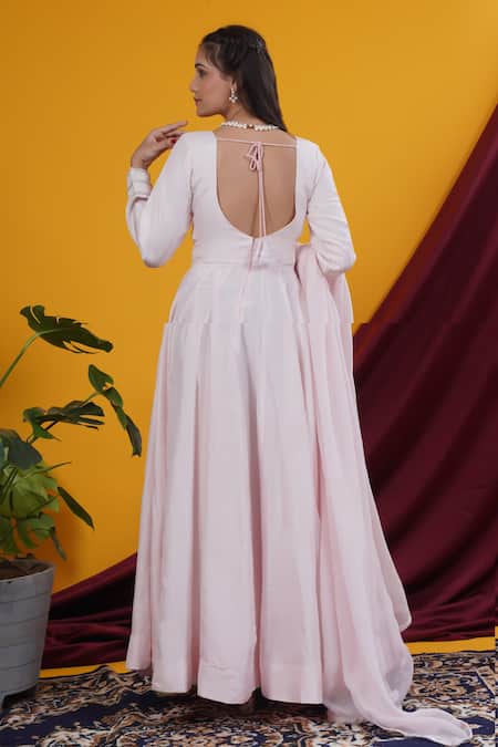 Baby pink Anarkali crafted from Viscose Russian Silk, featuring a double yoke design and kali construction with handwork details. Paired with a coordinating dupatta.