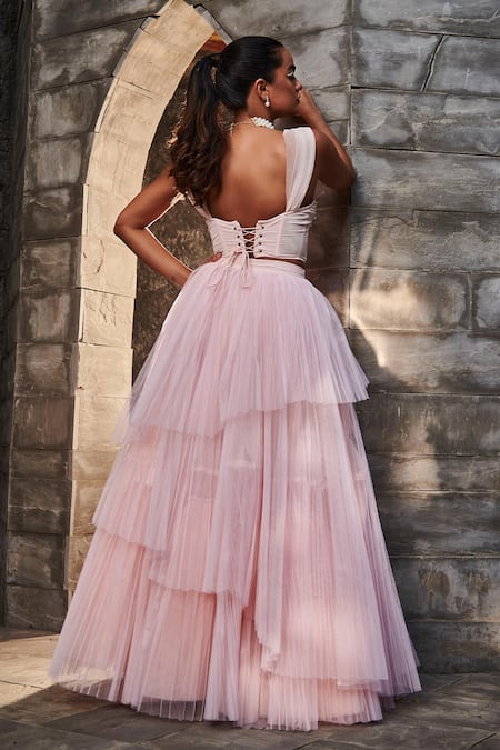 Pink lehenga skirt featuring pleated fabric layers enhanced with attached can can