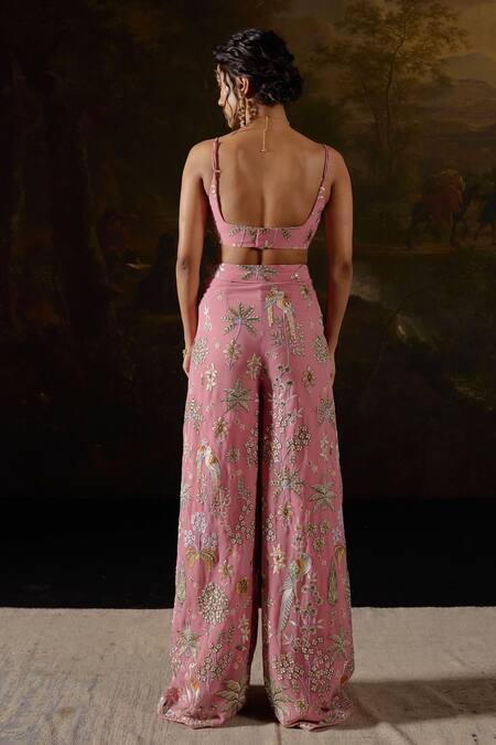 Pink Georgette, Polyester Embroidery Mayuri Parakeet Blouse Flared Pant Set