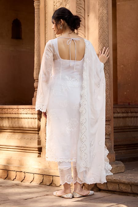 White kurta featuring a scoop square neckline, full bell sleeves, and intricate hand and machine embroidery. Paired with cigarette pants and a mirror georgette dupatta, adding elegance to the ensemble.