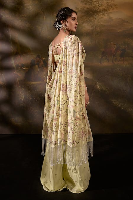 Yellow embellished bralette featuring a sweetheart neckline and sleeveless design. Paired with a matching cape adorned with floral thread embroidery and sequins, along with wide-leg pants.