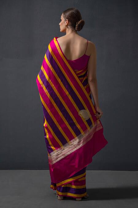 Magenta Satin Zari And Purple Stripe Handloom Saree