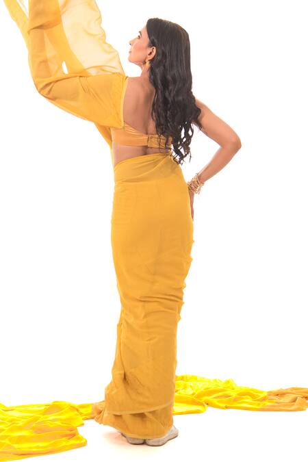 Mustard georgette saree featuring placement paisley buttis and a tasselled pallu