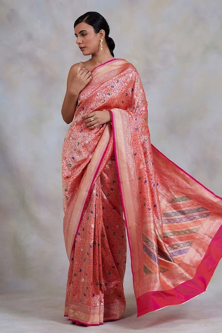 Buy_Priyanka Raajiv_Pink Banarasi Kadua Silk Floral Motifs Sadabahaar Woven Saree_at_Aza_Fashions
