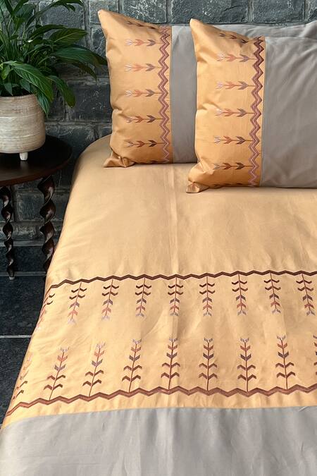 Honey mustard cotton bedsheet set with arrow detailing which includes 1 bedsheet & 2 pillow covers.