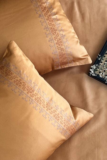 Honey mustard bedsheet in cotton base and square shaped. Comes with rectangular shaped pair of Delight pattern pillow covers.