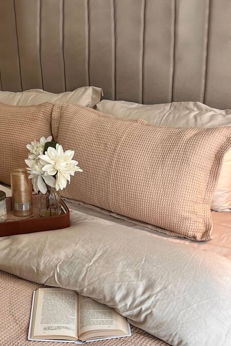 Oats beige bedsheet in a woven cotton base. Comes with 4 rectangular shaped pillow covers and 1 duvet covers with honeycomb patterns.