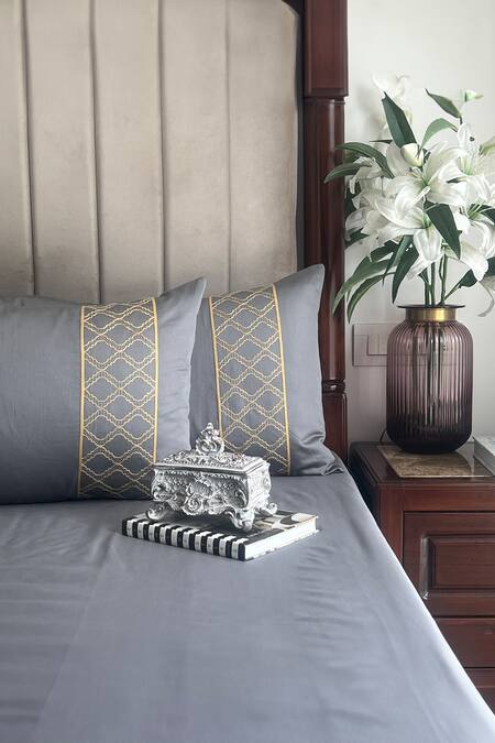 Shop_Sadyaska_Grey Cotton Rich Maroc Solid Bedsheet Set_at_Aza_Fashions