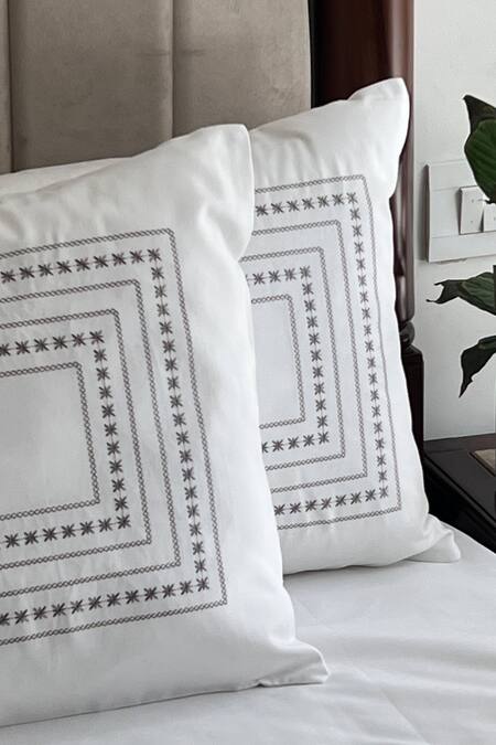 White cotton bedsheet. Comes with two pillow cases with all over geometric stripe pattern & thread embroidery.