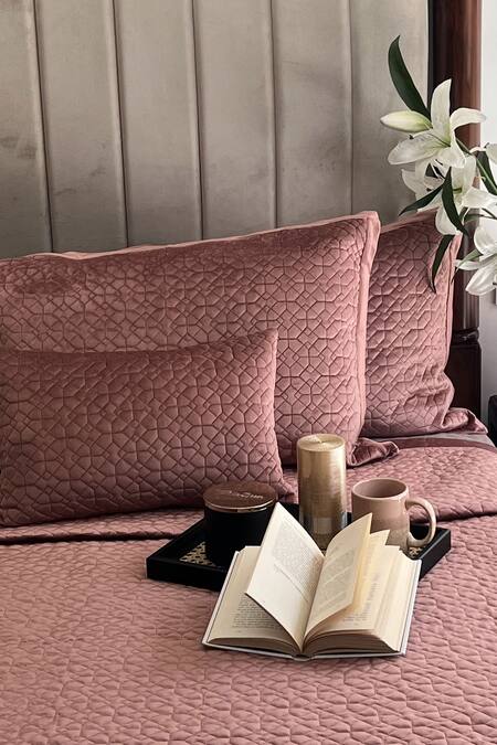 Blush velvet bedspread with all-over nouveau detail quilted patterns. Comes with rectangular-shaped pillow covers.