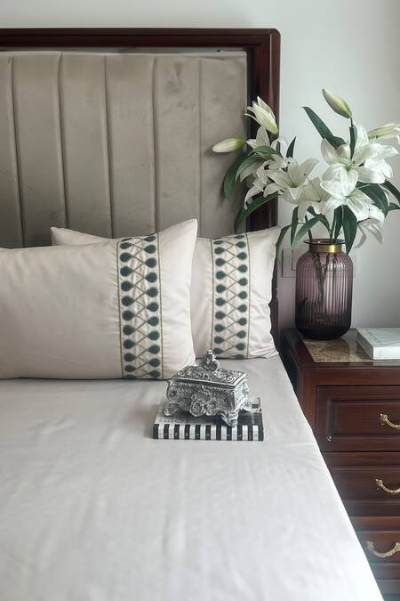 Ivory king size bedsheet in cotton rich base. Comes with two rectangle shaped pillow cover with thread embroidered border in geometric pattern.