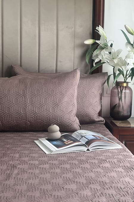 Taupe reversible quilted bedspread with zephyr geometric patterns. Comes with set of 2 matching pillow covers.