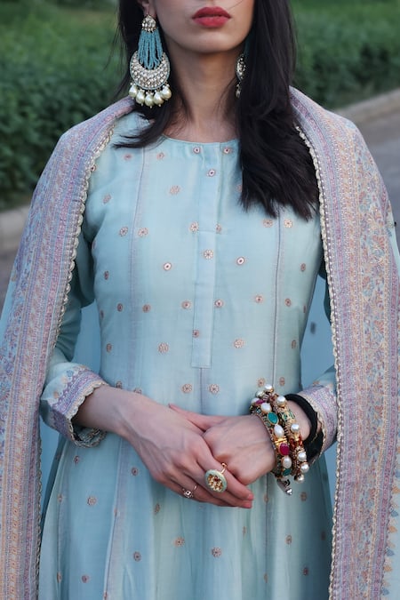 Buy_Safaa_Green Vegan Silk Sitara Work And Aari Round Aab Anarkali Set _at_Aza_Fashions