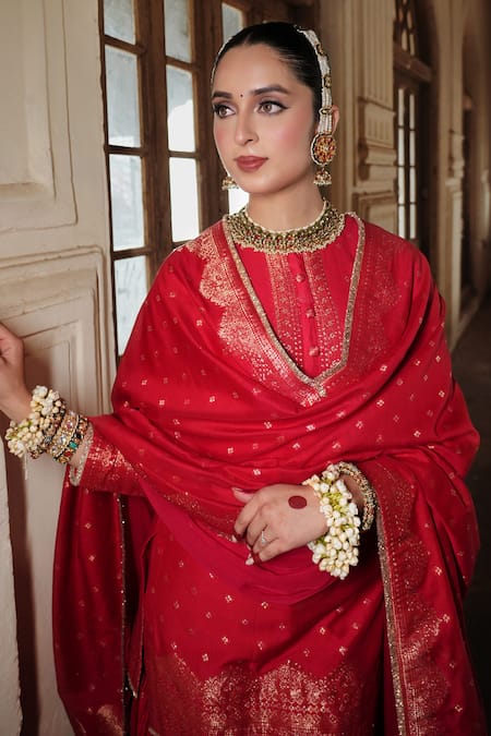 Red kurta featuring woven floral butti motifs and kiran lace borders. Paired with a matching gharara and dupatta.