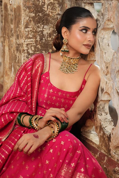 Magenta anarkali featuring woven floral butti and kiran lace borders. Set includes a matching pant and dupatta.