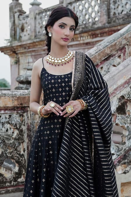 Black strappy anarkali featuring woven floral butti and kiran fringe lace borders. Paired with a matching pant and dupatta.