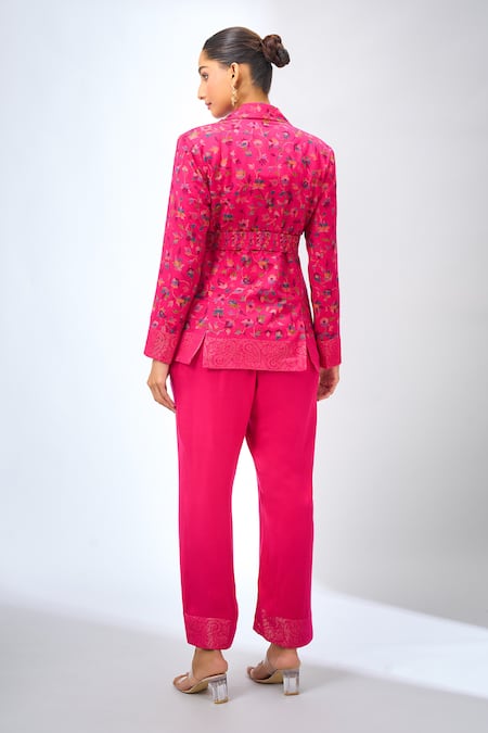 Pink floral print jacket featuring a belted waist and long sleeves. Paired with a matching inner bustier and relaxed fit pants with embroidered edges.