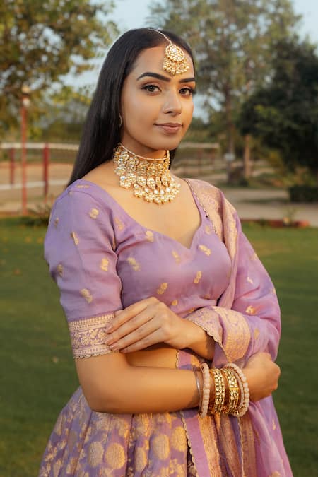 Lilac organza lehenga with floral pattern gold banarasi weave & border. Paired with sweetheart neck booti pattern blouse with floral border on sleeves & dupatta.