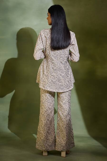 Ecru jacket style tunic with woven floral motifs. Comes with flared pants.