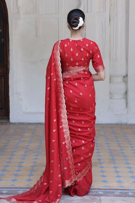 Red saree crafted in moonga silk featuring gold toned Mughal flora vine woven detail along the scallop border and damask butti detail. Paired with a matching half sleeves closed round neck blouse.
