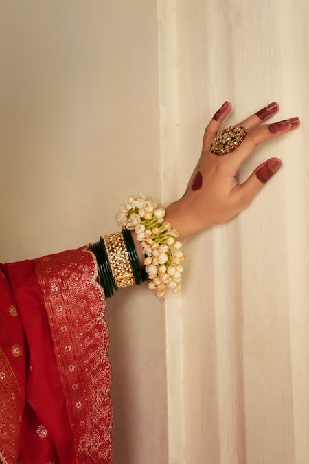 Red lehenga featuring woven floral buttis and a geometric border. Paired with a padded blouse and a dupatta with kiran lace fringe.