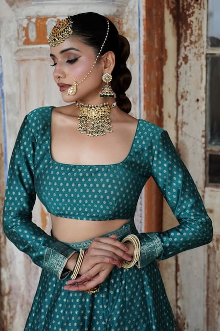 Turquoise lehenga featuring floral butti, peacock motifs, and zari threadwork scalloped border. Paired with a padded blouse and dupatta with attached lining.