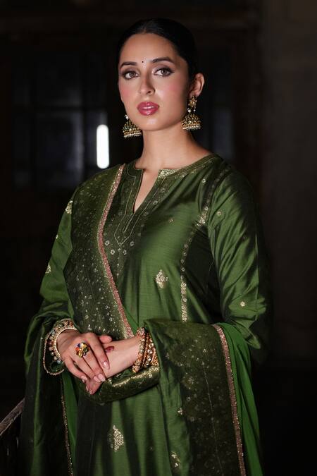 Green Silk, Velvet Embroidery, Lace Split Raha Floral Vine Woven Kurta Pant Set