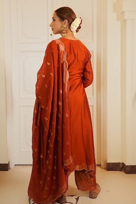 Rust kurta featuring woven paisley motifs and scalloped hem. Paired with straight pant and dupatta with woven border and scalloped trim.