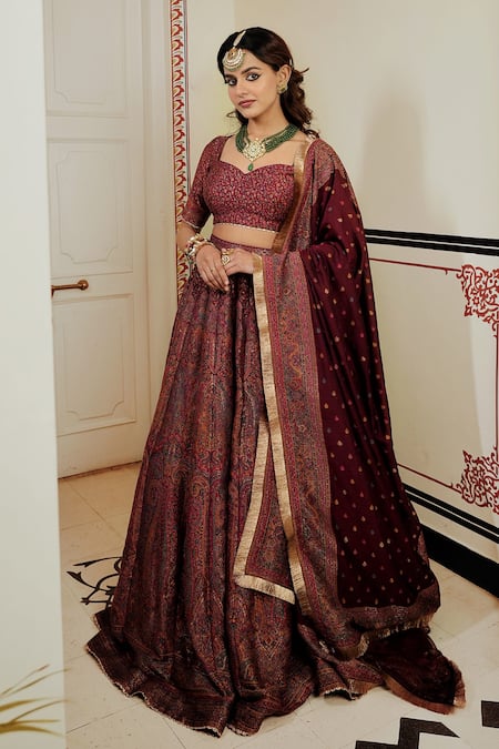 Maroon lehenga featuring floral and paisley motifs with a scallop trim hem. Accompanied by a sweetheart neckline padded crop top and a woven dupatta with fringe border.