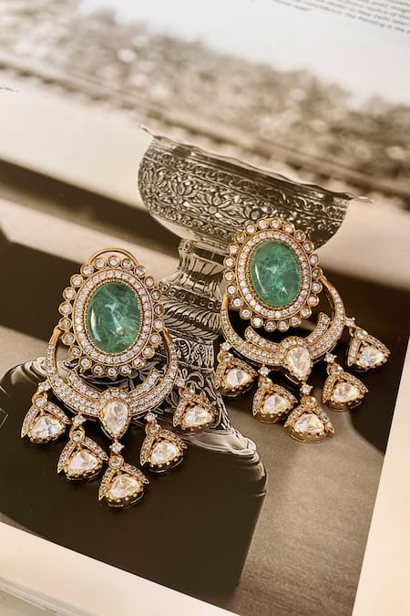 Blue designer necklace featuring intricate embellishments and paired with matching earrings. The earrings showcase a similar design with a blend of stones and intricate detailing.