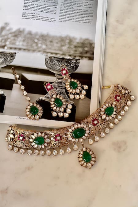 Designer green necklace featuring intricate gold detailing and embellished with green stones and pink accents. Paired with matching earrings adorned with similar design elements.