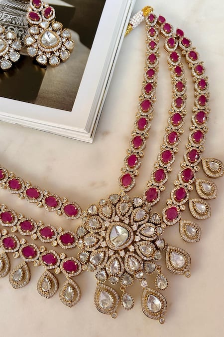 Gold Plated Gemstones, Designer Pink Necklace And Earring Set