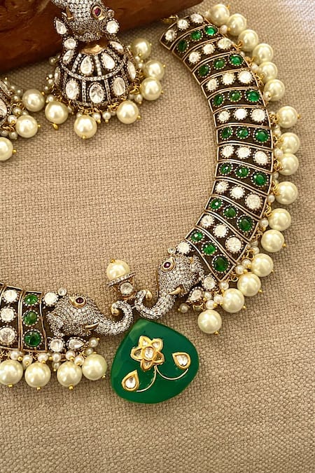 Elephant motif detailing on the necklace, Pearl drop embellishments, Intricate green stone inlay