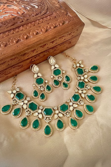 Green designer necklace featuring hexagonal and teardrop shaped stones with intricate embellishments. Paired with matching earrings that complement the necklace design.
