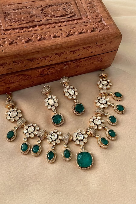 Green Faux Diamonds, Stones Designer Necklace And Earring Set