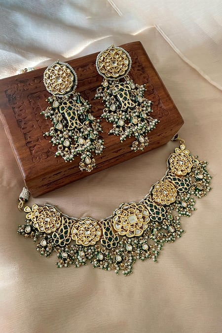 Green designer necklace featuring intricate gold-tone embellishments and beadwork. Paired with matching earrings adorned with similar decorative elements.